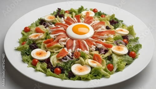 A festive salad with smoked salmon, egg, and cherry tomatoes