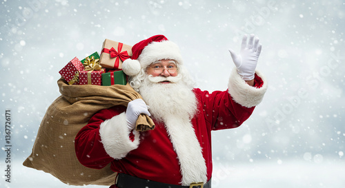 A festive Santa Claus holding a sack of gifts amidst a snowy winter landscape, embodying the Christmas spirit.