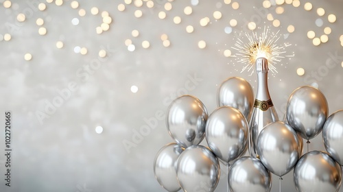 A festive scene featuring a champagne bottle surrounded by silver balloons against a shimmering background, perfect for celebrations and parties.