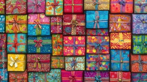 A festive scene with a stack of colorful Christmas gift boxes wrapped in vibrant, patterned paper