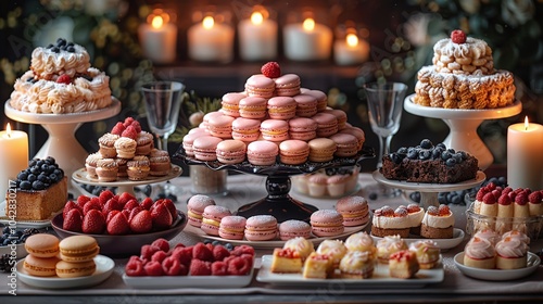 A festive table set up for a Christmas or New Year's Eve candy bar. Beautiful dessert table with various pastries and cozy candlelight decorations