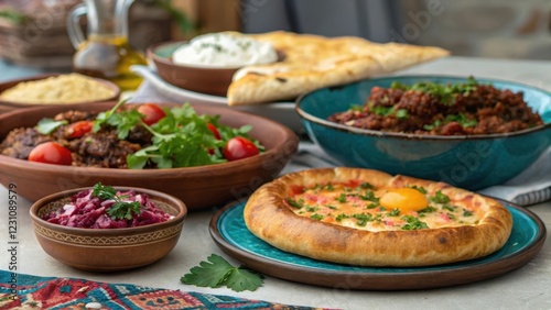 A Festive Table Spread Featuring a Variety of Savory Dishes and Flatbreads