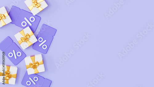 A festive white gift with a golden bow and purple coupons on the table. For favorable discounts and sale for various promotions. With an empty space for the text. 3d rendering illustration.