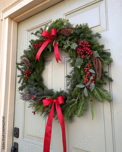 A festive wreath made of natural fir, decorated with red satin ribbons, holly berries and pine cones