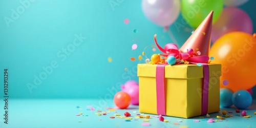 A Festive Yellow Gift Box with Colorful Balloons and Confetti for a Joyful Celebration