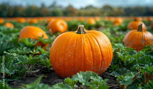 A field of pumpkins with one large pumpkin in the foreground. The pumpkins are orange and are scattered throughout the field