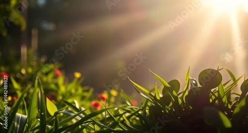 A field of red flowers and green grass illuminated by bright sun rays
