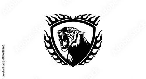 A fierce black panther with bared teeth is depicted within a shield emblem surrounded by flames.