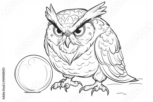 A fierce cartoon owl with sharp eyebrows stands next to a shiny orb, showcasing a whimsical yet stern expression.