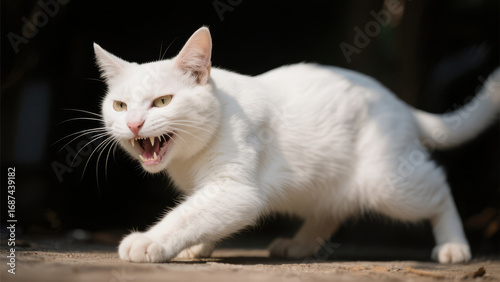 A fierce white cat with bared teeth lunges forward its yellow eyes narrowed in aggression.