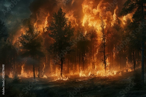 A fierce wildfire engulfs a dense forest in flames under a dramatic evening sky