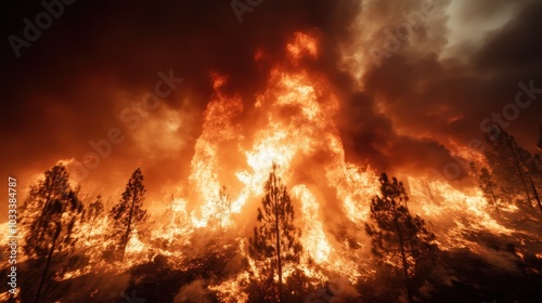 A fierce wildfire rages through a forest, with flames reaching high into the sky, showcasing nature's raw power and the urgent need for environmental mindfulness.