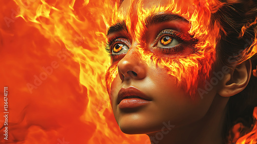 A fierce woman stares through crackling flames, her face partially burned yet still radiating raw power.
