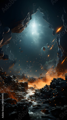 A fiery, alien landscape with a river flowing through a rocky valley. The sky is filled with glowing debris and a bright light shines through a gap in the cliffs.