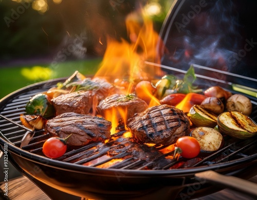 A fiery burst of flame over a grill, with vegetables and meats sizzling, capturing
