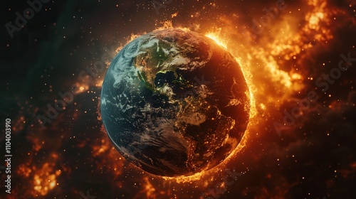 A fiery depiction of Earth surrounded by flames, symbolizing environmental change and cosmic phenomena.