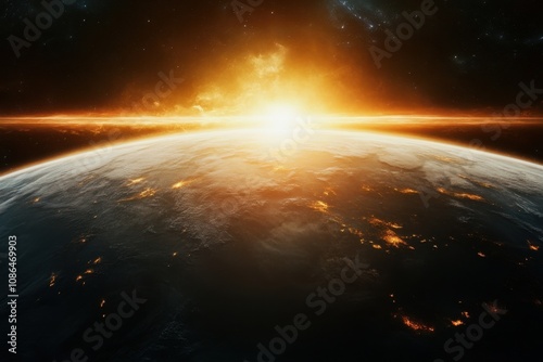 A fiery sunrise over a planet with a glowing city skyline.