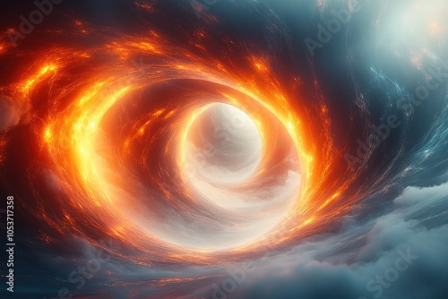 A fiery vortex in the sky with swirling clouds and a glowing orb in the center.
