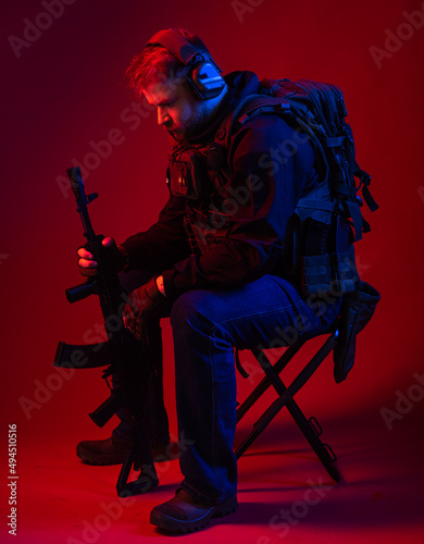 a fighter in equipment, body armor, headphones holds a machine gun, aims at the target, hits the target through the sight. military business concept. red background. blue-red light