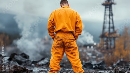 A figure dressed in an orange suit stands alone at an industrial site, surrounded by steam and rocky terrain, evoking themes of resilience and hard work amidst heavy machinery.