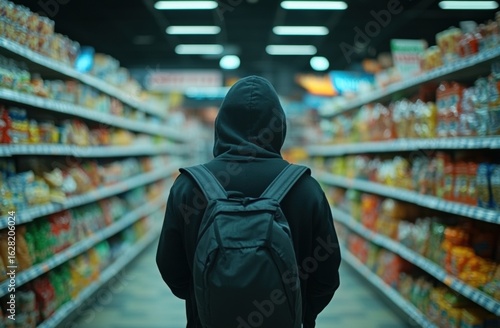 A figure in a hoodie stands in a grocery aisle filled with colorful snacks, creating a sense of mystery and intrigue.