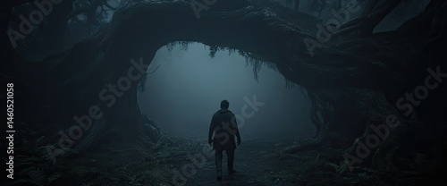 A figure walks alone through misty trees forming an arch, heading toward bright light