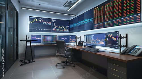 A financial analysta??s office with triple monitors, a standing desk, and a live stock market feed displayed on a wall screen