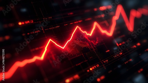 A financial chart with a bold red line ascending sharply, indicating positive economic progress, set against a dark background with glowing grid lines.