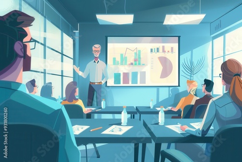 A financial expert presents insightful data using visual aids in a contemporary conference room, while participants attentively listen and take notes. Generative AI