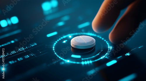 A finger hovers over a digital button on a glowing interface, symbolizing technology, medicine, and innovation in a futuristic setting.