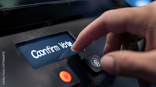 A Finger Presses a "Confirm Vote" Button on a Voting Machine