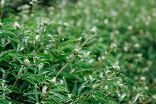 A Fire Ant crawling on a flower bud of a pink Peony, in the spring