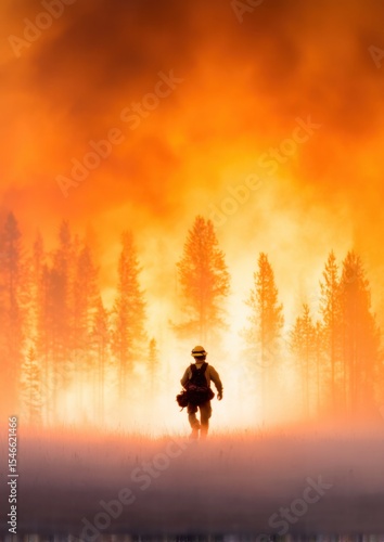 A firefighter bravely walks toward a raging wildfire engulfing a forest, with intense orange flames and smoke lighting up the sky.