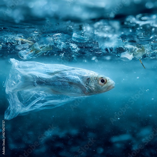 A Fish Caught in a Plastic Bag Drifting Through Ocean Waters, Symbolizing the Impact of Plastic Pollution on Marine Life