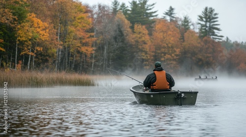 A fisherman navigating his boat through dense fog on a quiet lake, as distant loons call out in the morning silence.