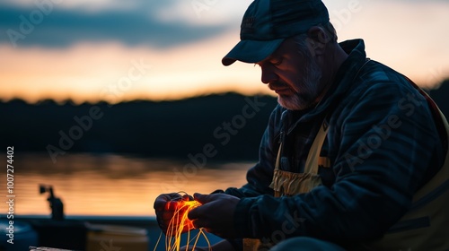 A fisherman prepares his tackle as the sun sets over the calm waters of a serene lake during a peaceful evening outing