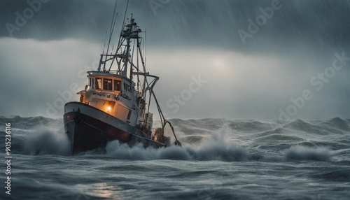 A fishing trawler caught in a freezing rainstorm at dawn, with icy waves crashing against its sides