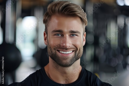 A fit muscular male personal trainer smiling at the camera in a gym, close up