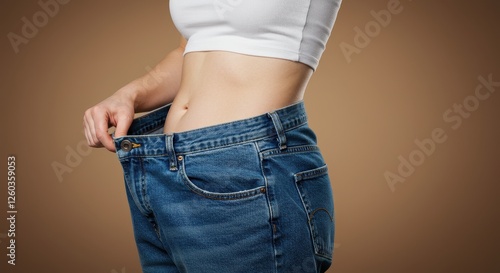 A fit woman in a white crop top and oversized blue jeans pulls the waistband away from her stomach and proudly showcasing her weight loss
