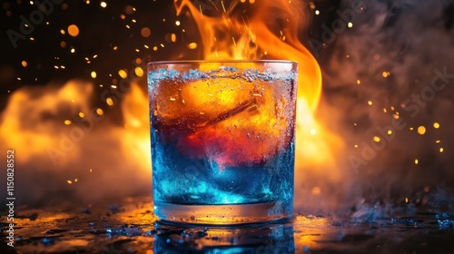 A flaming cocktail with layers of blue and orange liquor, surrounded by dramatic shadows and sparks