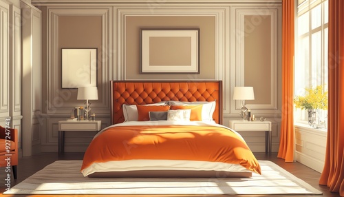 A flat art illustration of a stylish bedroom with a tufted headboard, luxury bedding, and elegant decor, ideal for modern home themes, space for text, high detailed
