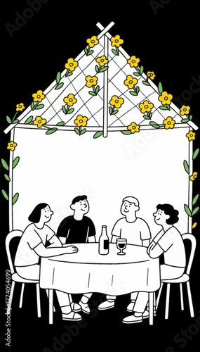 A flat black and white doodle illustration of a group of friends who had a picnic, next to them stands a bungalow decorated with yellow flowers. Vector graphics. EPS.