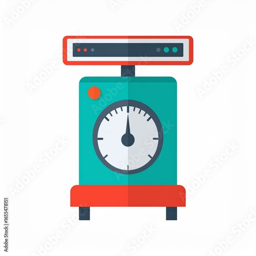 A flat design illustration of a vintage-style weighing scale, featuring a teal colored body and an orange base, with a clear clock face.
