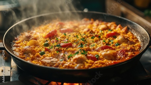 A flat, hot pan of paella being cooked on a stove top with steam rising from it.