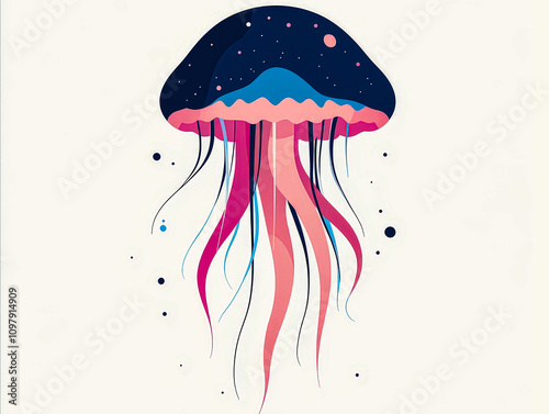 A Flat Illustration of a Jellyfish with Flowing Tentacles in Soft Pink and Blue Hues