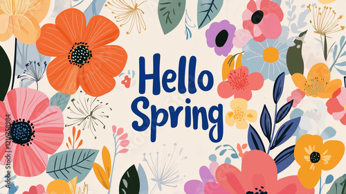 A flat illustration of colorful flowers and leaves with the text "Hello Spring" in blue letters
