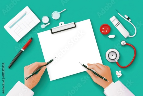 A flat lay of a doctor's workspace featuring a clipboard, pens, a stethoscope, and medical tools on a vibrant turquoise background.
