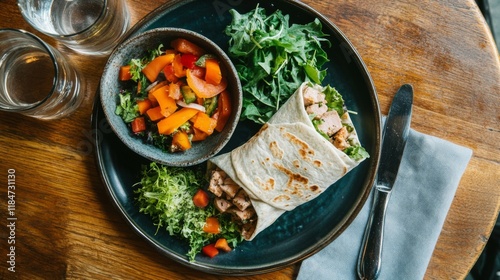 A flat lay of a simple and healthy meal with tuna, including a tuna wrap, a side of mixed greens, and a glass of water, arranged neatly on a dining table.