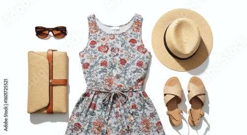 A flat lay of a summer outfit featuring dress, accessories, and footwear.