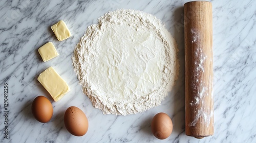 A flat lay of baking essentials: flour, eggs, butter, and a rolling pin on a marble surface. picture